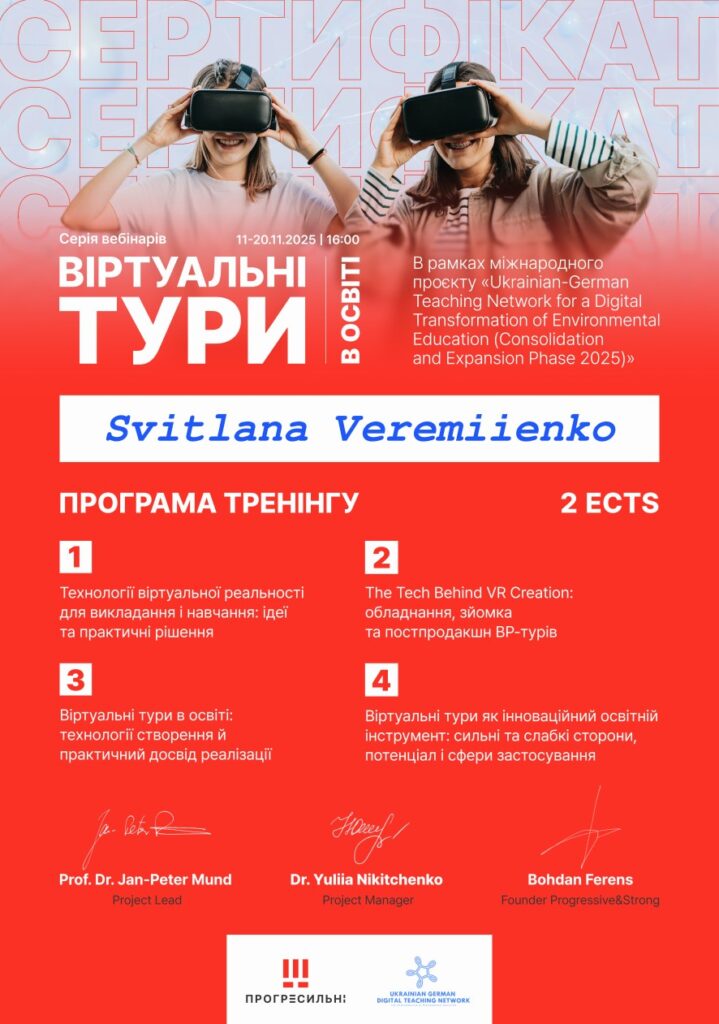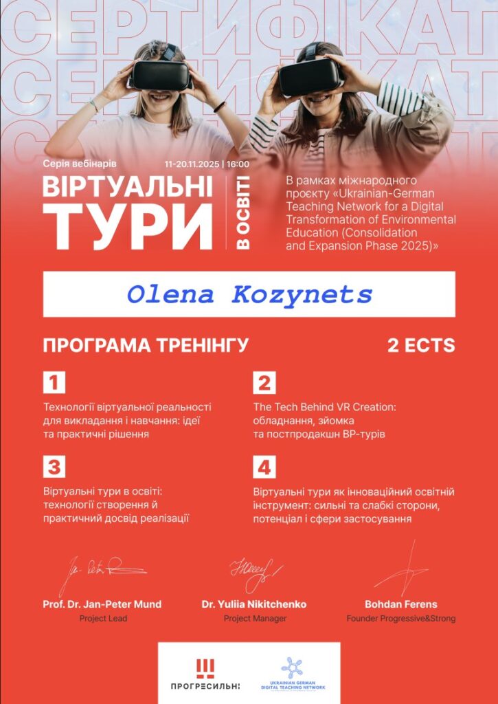 20 листопада 2025 р. НПП кафедри правоохоронної діяльності та загальноправових дисциплін доцентка Олена Козинець та старша викладачка Світлана Веремієнко завершили проходження курсу на тему «Віртуальні тури в освіті» – і це був по-справжньому надихаючий досвід!